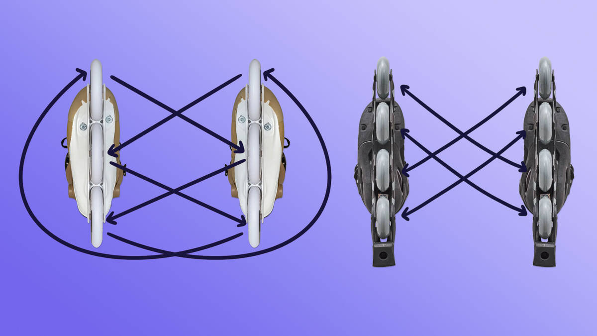 A fenti képen látható egy jó módszer a kerekek pozíciójának elforgatására a 3 kerekű egysoros görkorcsolyaokon. A cél az egyenletes kopás biztosítása mind a hat keréken, hogy növelje az élettartamukat.