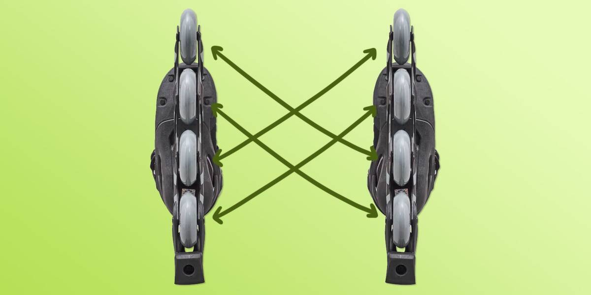 A 4 kerekű egysoros görkorcsolyák kerékhelyzetének felcserélésének legelterjedtebb módszere az egyik korcsolya két hátsó kerekének felcserélése a másik korcsolya két első kerekével, ahogy a fenti képen látható.